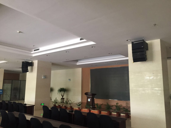 3、現場層高問題:現場廳內高度為4.5m,加上聲學環境,我們采用目前音響行業內最為先進的有源線性陣列音響。優異的指向性、大范圍的聲場覆蓋、高標準的安裝方式完全滿足了業主近似苛刻的音視頻要求。目前此次項目已經投入使用,并圓滿召開了多次會議。優秀的方案設計、過硬的設備和嚴謹的施工布線組成這套完整的音視頻工程贏得了業主的滿意。